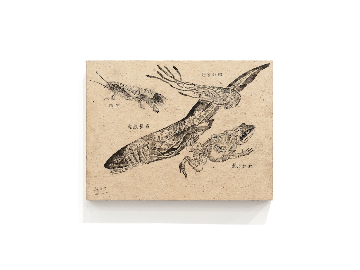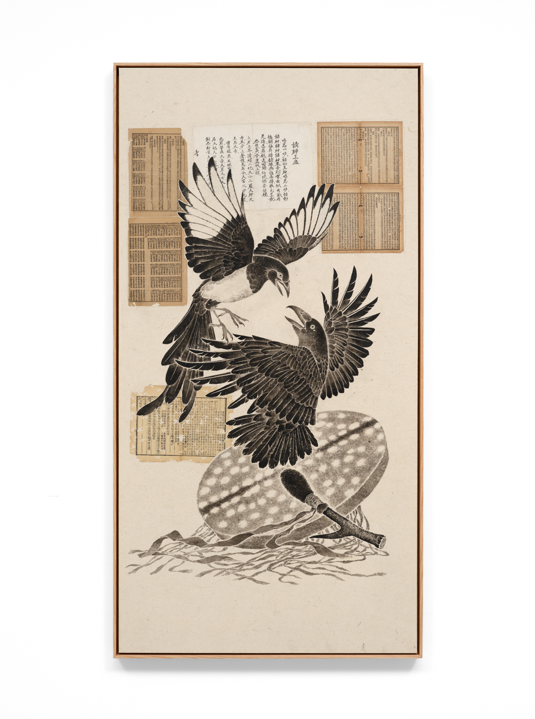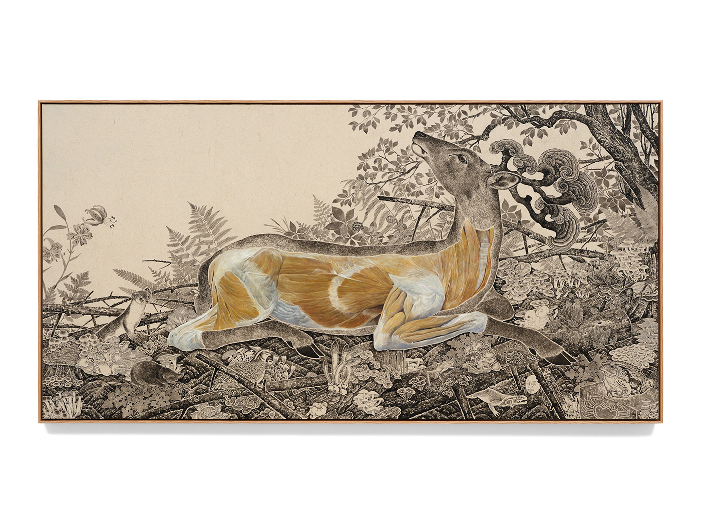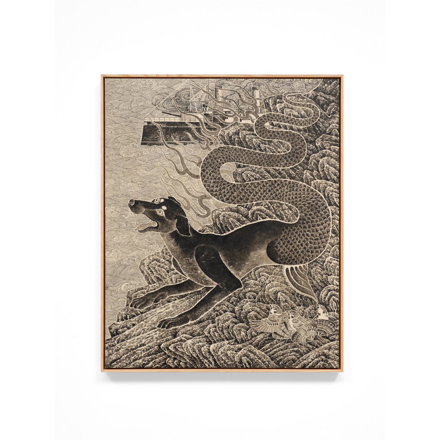 Zhang Wenzhi creates collagesque ink paintings which interweave Chinese modern history, folklore, popular science, and archival materials. Using his hometown as an entry point, Zhang spotlights the convoluted history of Northeast China, particularly the period dating to the late Qing Dynasty, delineating the repercussions of the past in the present. The region was once exploited by various colonial powers before undergoing rapid urbanization, leaving it in a collective state of amnesia. Zhang depicts spirit animals and mythological creatures, including the Deer god, pointing to the prominence of shamanism in Northeast China. They become metaphoric of life and prosperity in a place once subjected to trauma and constant shifts in power. In Zhang’s paintings, these auspicious creatures are juxtaposed against a vast landscape where historical and mythological motifs are nestled within industrial infrastructures, bearing witness to the region’s ever-unfolding changes and complex historical tapestry.