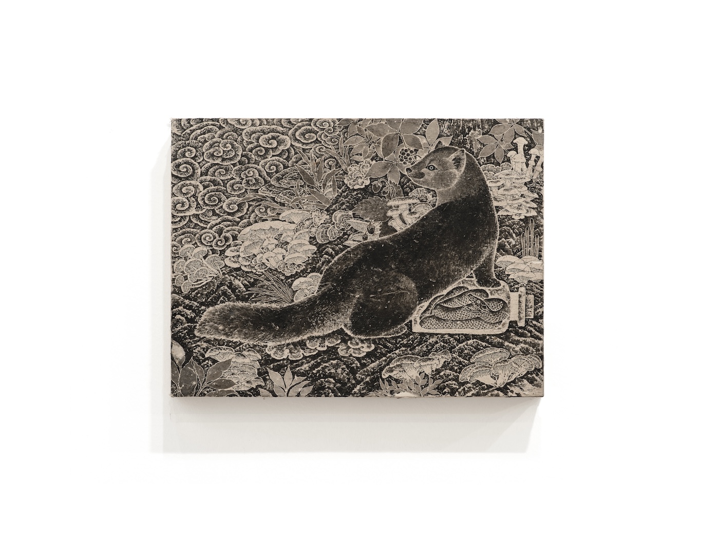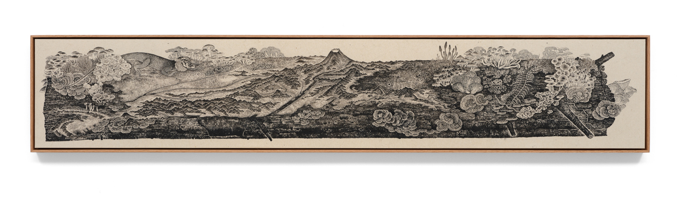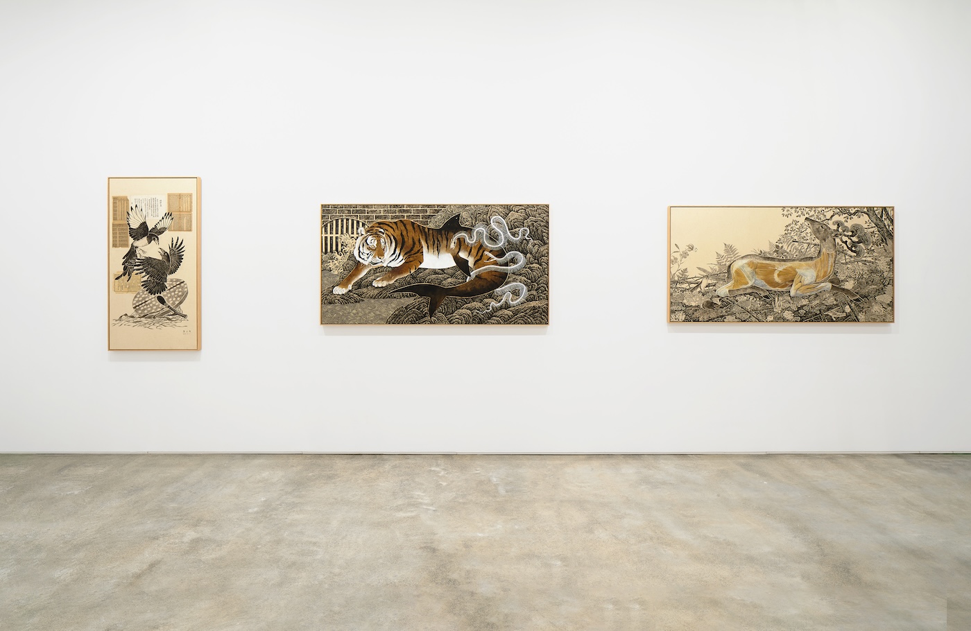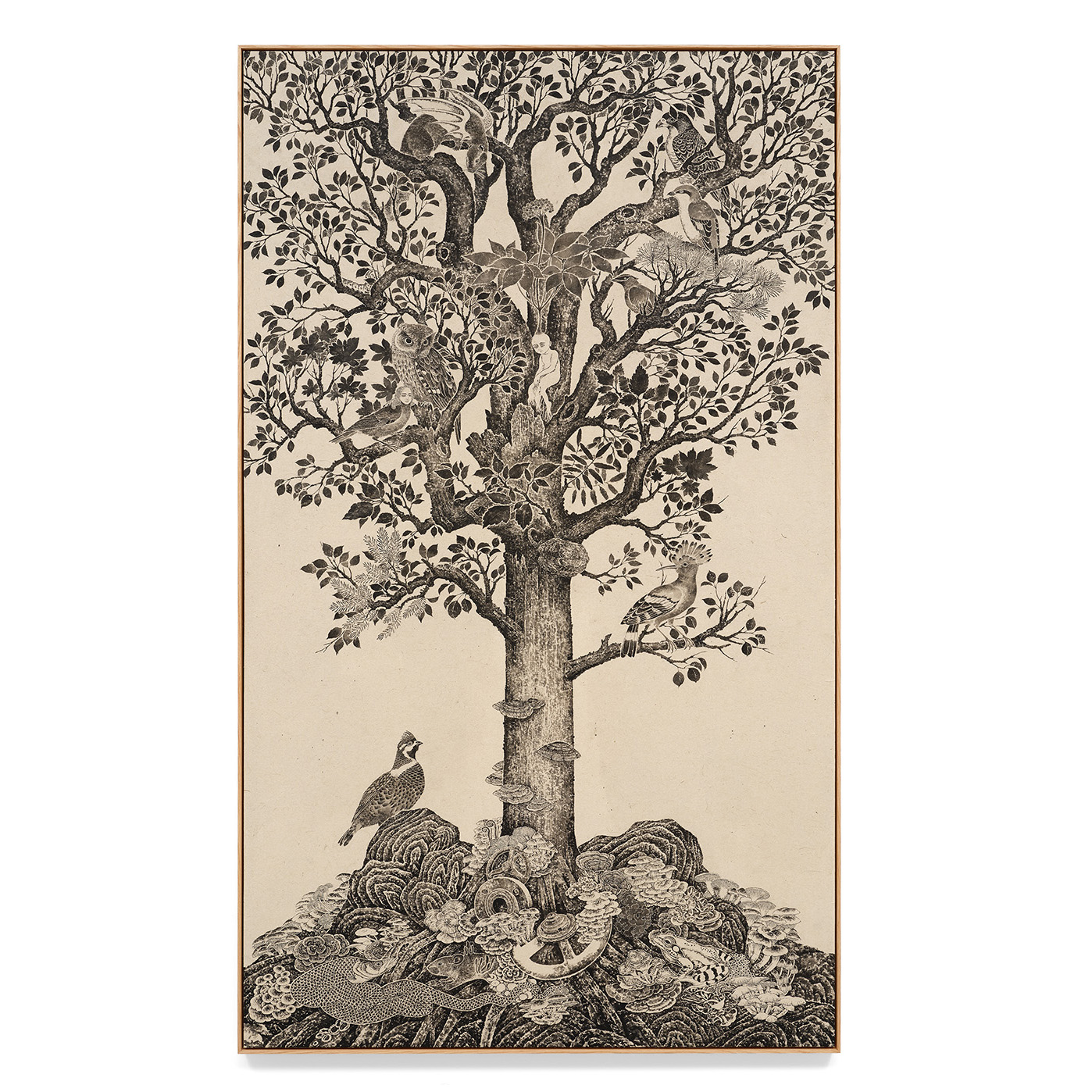 Zhang Wenzhi creates collagesque ink paintings which interweave Chinese modern history, folklore, popular science, and archival materials. Using his hometown as an entry point, Zhang spotlights the convoluted history of Northeast China, particularly the period dating to the late Qing Dynasty, delineating the repercussions of the past in the present. The region was once exploited by various colonial powers before undergoing rapid urbanization, leaving it in a collective state of amnesia. Zhang depicts spirit animals and mythological creatures, including the Deer god, pointing to the prominence of shamanism in Northeast China. They become metaphoric of life and prosperity in a place once subjected to trauma and constant shifts in power. In Zhang’s paintings, these auspicious creatures are juxtaposed against a vast landscape where historical and mythological motifs are nestled within industrial infrastructures, bearing witness to the region’s ever-unfolding changes and complex historical tapestry.