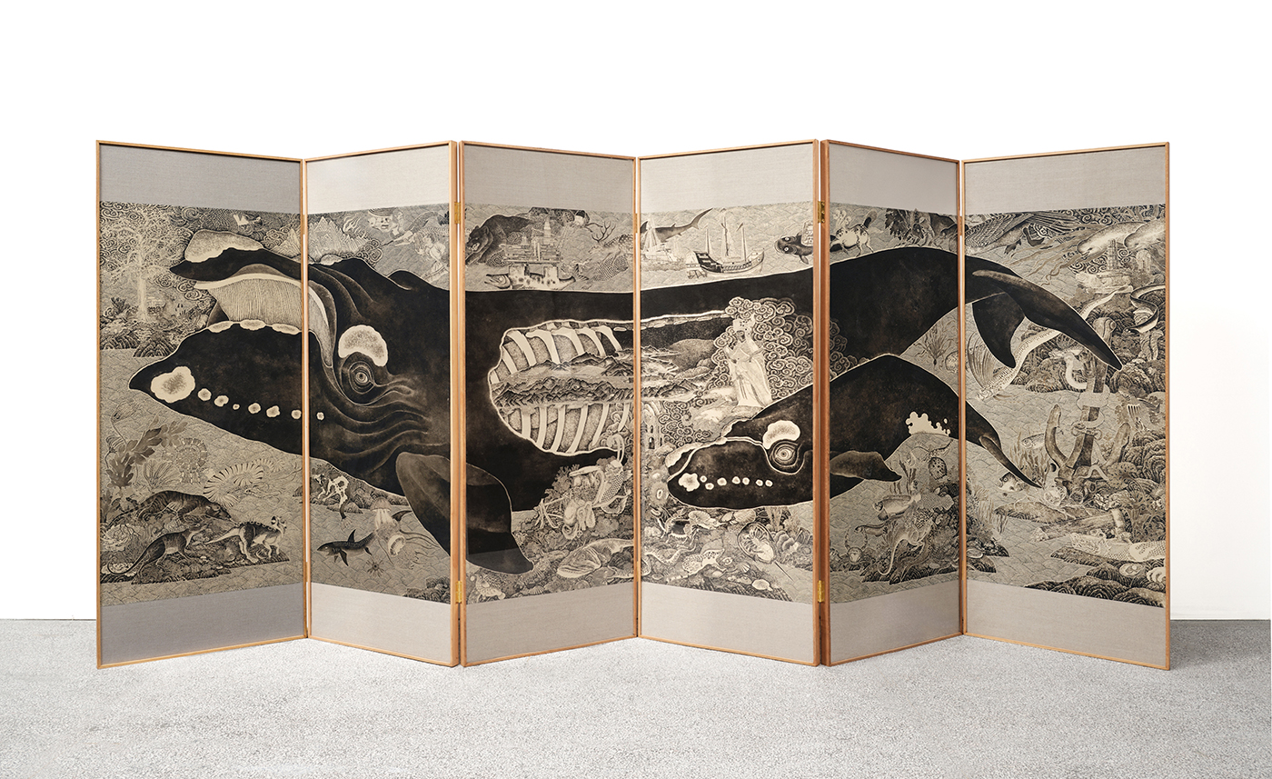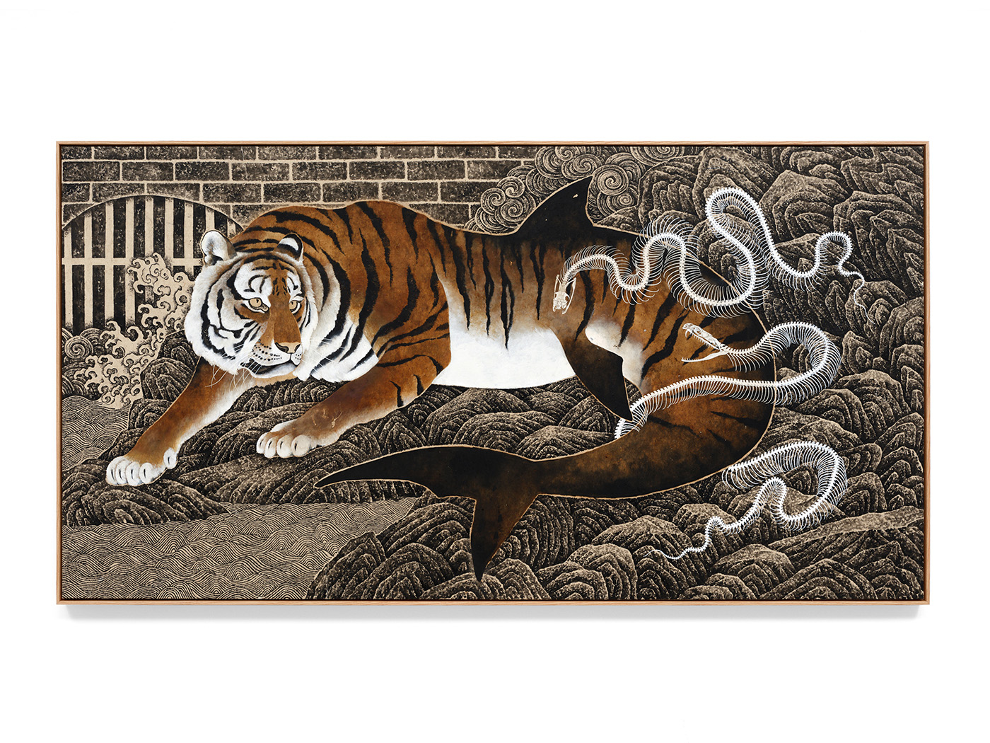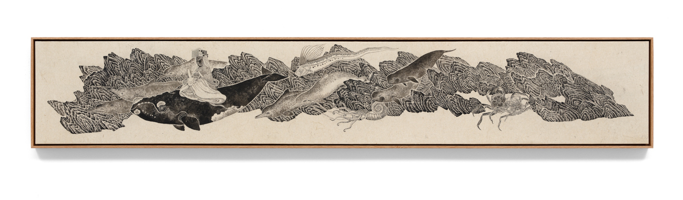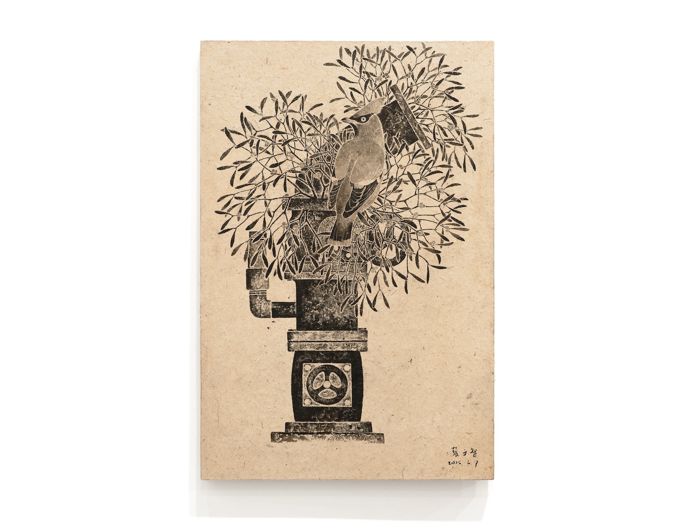 Zhang Wenzhi creates collagesque ink paintings which interweave Chinese modern history, folklore, popular science, and archival materials. Using his hometown as an entry point, Zhang spotlights the convoluted history of Northeast China, particularly the period dating to the late Qing Dynasty, delineating the repercussions of the past in the present. The region was once exploited by various colonial powers before undergoing rapid urbanization, leaving it in a collective state of amnesia. Zhang depicts spirit animals and mythological creatures, including the Deer god, pointing to the prominence of shamanism in Northeast China. They become metaphoric of life and prosperity in a place once subjected to trauma and constant shifts in power. In Zhang’s paintings, these auspicious creatures are juxtaposed against a vast landscape where historical and mythological motifs are nestled within industrial infrastructures, bearing witness to the region’s ever-unfolding changes and complex historical tapestry.
