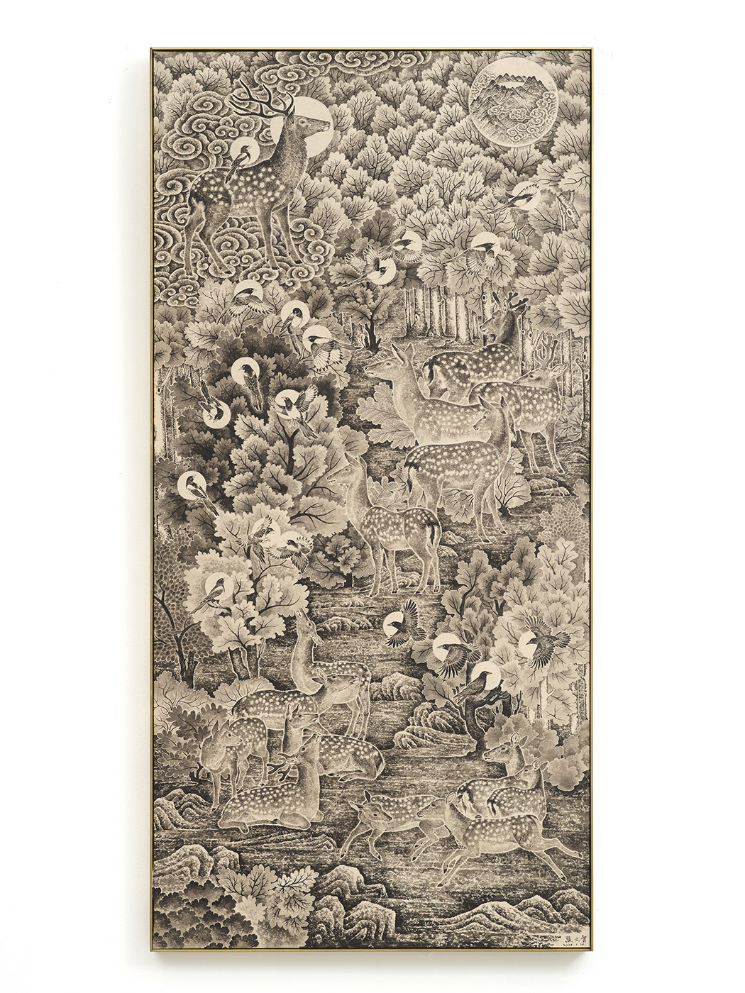 張文智的水墨創作融合了中國近現代史、民間傳說、以及通俗生物學等。他將文獻資料拼貼於水墨作品上,想象了一個由野生動植物、薩滿教以及歷史故事組成的維度。他以出生地大連為切入點,聚焦中國東北自晚清時期起錯綜複雜的歷史,勾勒出過去對現在的潛在影響。大連曾一度受到各方殖民勢力的剝削,其後經歷了快速的城市化發展。然而經濟的騰飛卻帶來了集體性的歷史失憶。 張文智描繪各類自然生靈和動物標本,比如薩滿教中的鹿神,體現了薩滿教在東北地區的重要意義。在這個曾經飽受創傷且政權更迭頻繁的地方,靈性動物意喻著繁榮與生命力。在張文智的作品中,靈獸及各種神話象徵並置於遼闊的工業化景觀中,默默見證著這裡的滄海桑田和複雜歴史。