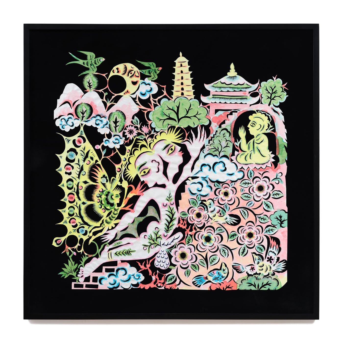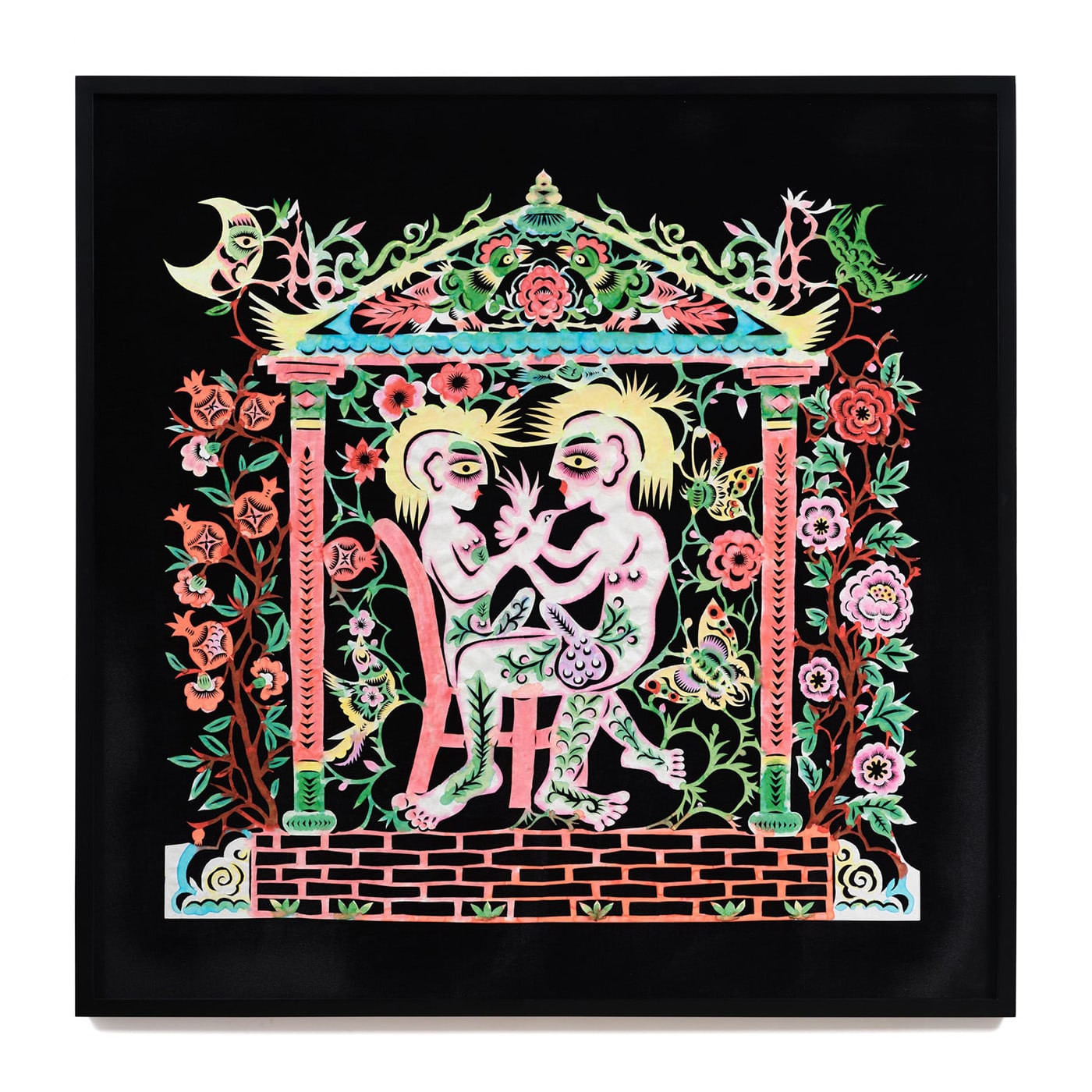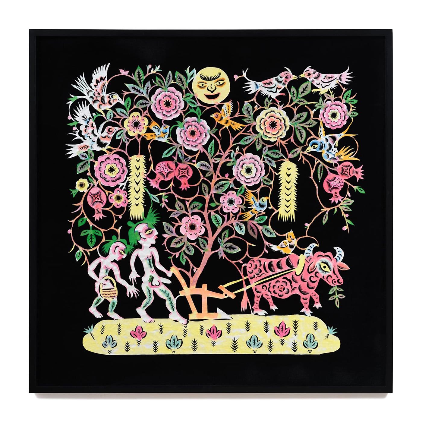 西亞蝶從未接受過系統性的藝術學院培訓。他最早的審美啟蒙源於童年時祖父的花園,種植著各色花朵,蝴蝶紛飛。後來,他初中輟學,下地耕種蘋果、小麥、紅薯、玉米。他總說自己只是個農民,來自黃土。即使現在已遷居城市,他的歸屬感依然深繫那片黃土。正因如此,他的作品始終以繁花、農田為背景,描繪酷兒之愛。